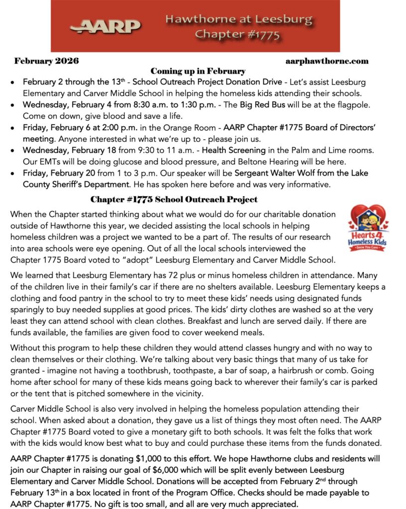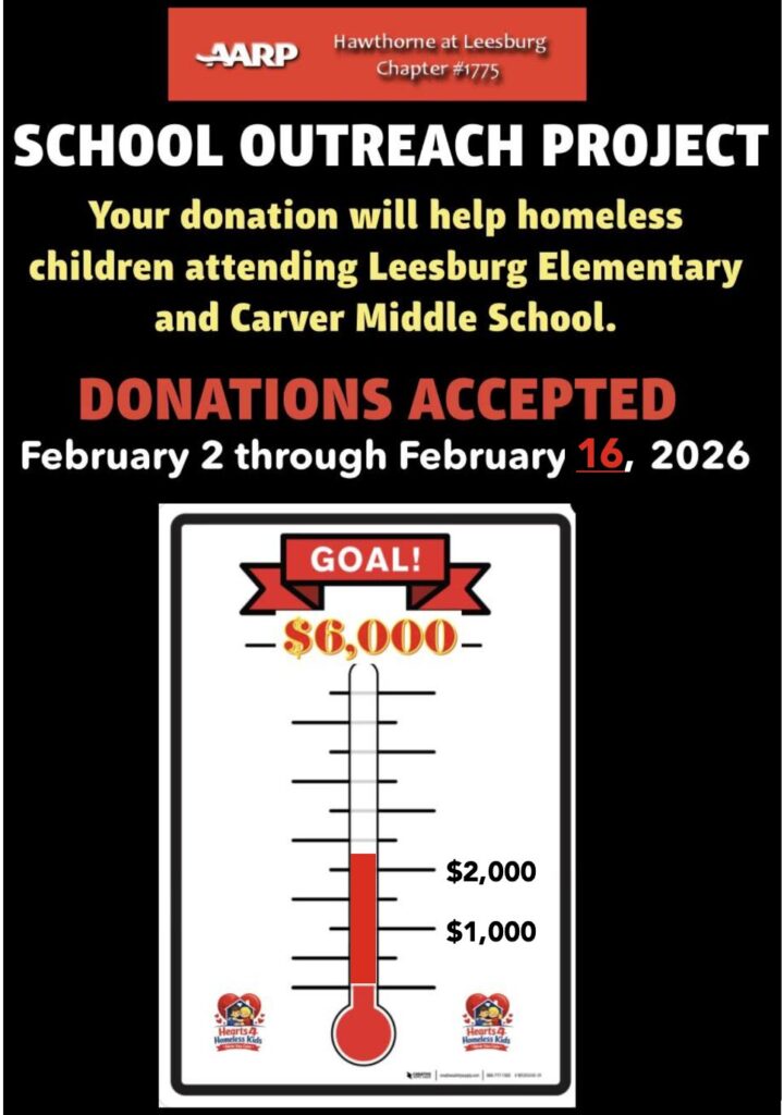 AARP Chapter #1775 is donating $1,000 to this effort. We hope Hawthorne clubs and residents will join our Chapter in raising our goal of $6,000 which will be split evenly between Leesburg Elementary and Carver Middle School. Donations will be accepted from February 2nd through February 13th in a box located in front of the Program Office. Checks should be made payable to AARP Chapter #1775. No gift is too small, and all are very much appreciated.